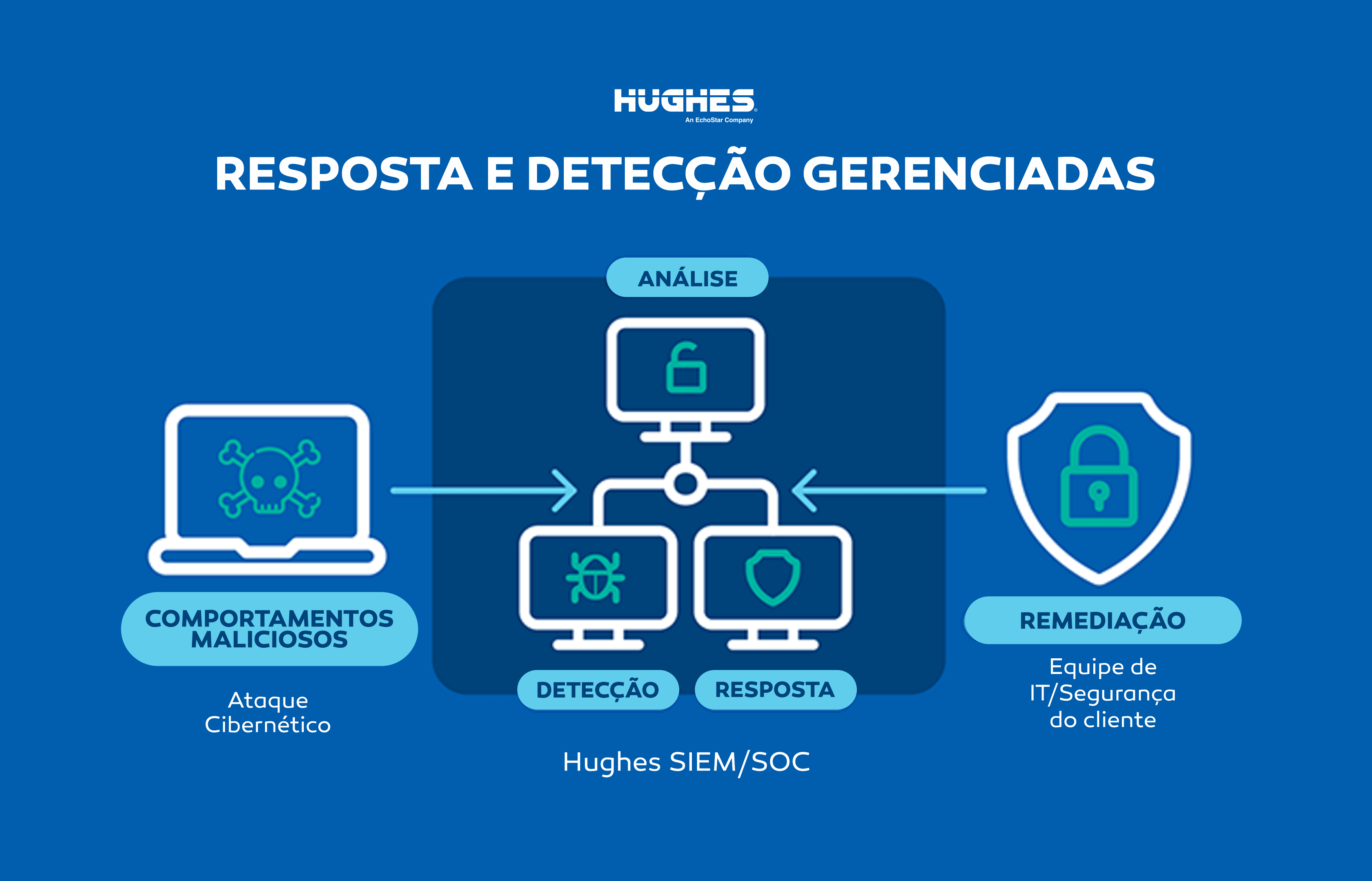 O Serviço de Detecção e Resposta Gerenciada da Hughes (Hughes Managed Detection and Response - MDR) mantém os cibercriminosos afastados com intervenção proativa, resposta a incidentes em tempo real e contenção de ameaças. Fique tranquilo sabendo que a Hughes fornece a tecnologia de última geração, processos de atuação adequados e pré-definidos além de pessoas extremamente capacitadas para ajudá-lo a prevenir, detectar e responder a ameaças cibernética em sua rede corporativa e dispositivos remotos (endpoint).